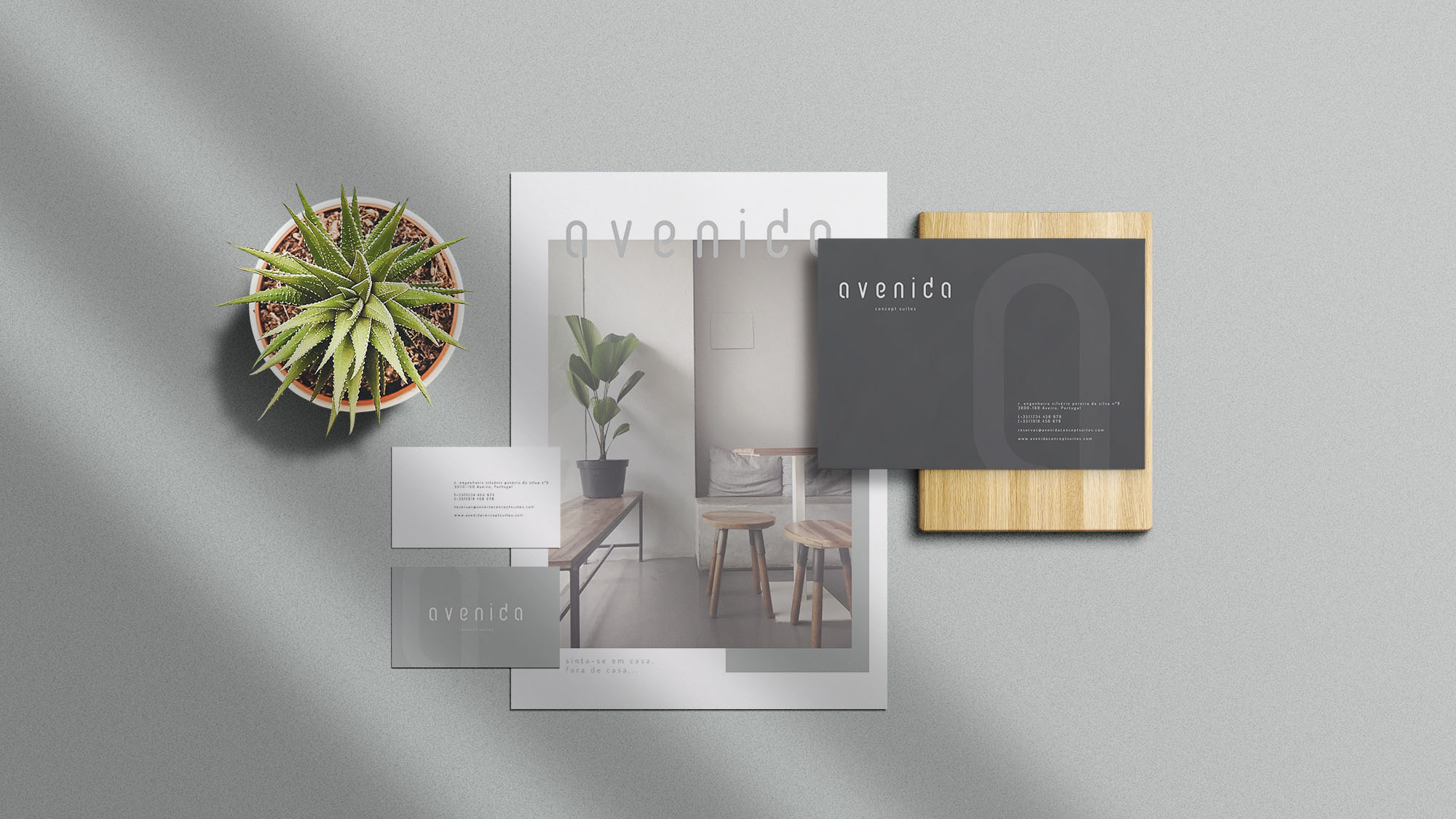 Conceito inspirado nas ideias chave do projecto: Ambiente/ linguagem moderna, sóbria, gama média/alta; bem como na forma do edificio/fachada.